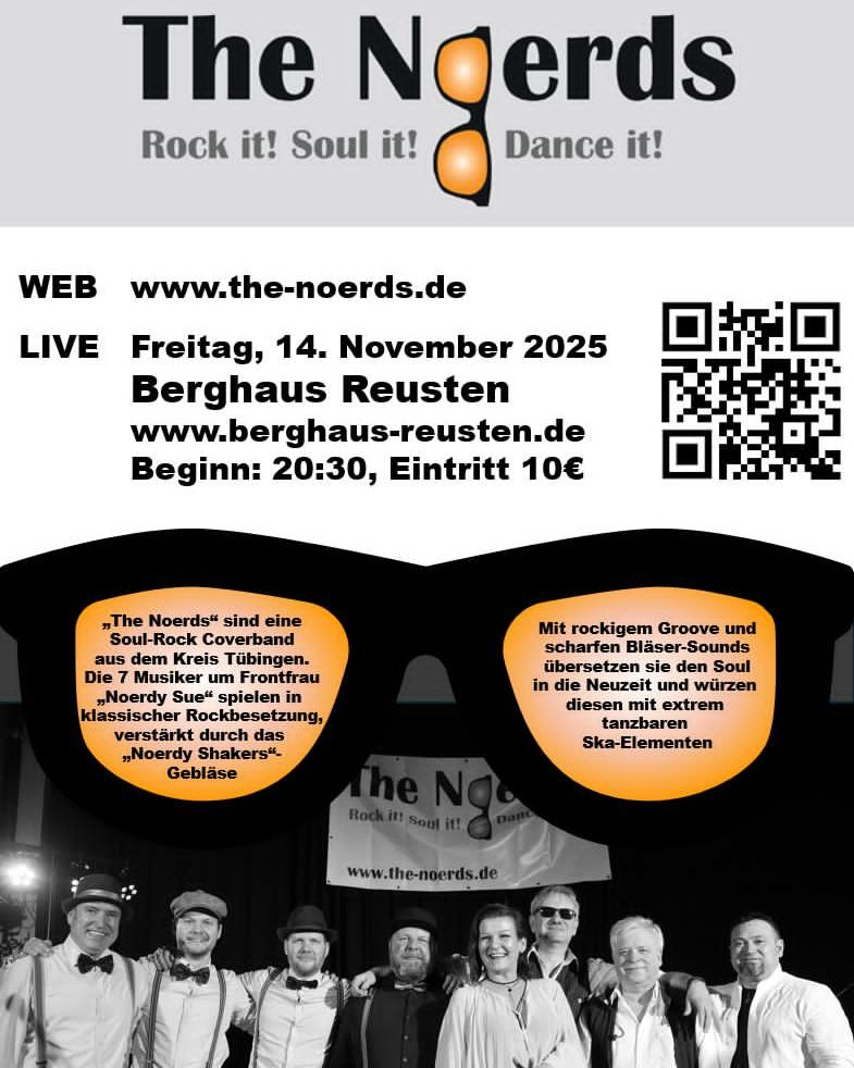 Aufgepasst, es ist wieder soweit! Im Berghaus wird gerockt. Wie in all den Jahren zuvor starten wir mit mit einem Live-Konzert von den fantastischen „Noerds“ in unsere bewährte 2er-Serie. Denn dem Noerds-Auftakt am Freitag 13.November 2025 folgt mit der Band „Souled Out“ die Fortsetzung ins neue Jahr. Am 3. Januar 2026, ein Samstag, gibt es mit Souled Out wahrscheinlich wieder eine volle Hütte, bunte Getränke, bockstarke Musik, tolle Stimmung. Los geht es jeweils um 20.30 Uhr, Karten gibt es nur an der Abendkasse, wir empfehlen daher ein wenig früher ins Berghaus zu kommen. Wer die „Noerds“ noch nicht kennt: Es ist eine unfassbare gute, achtköpfige (!) Liveband, die mit Bläsern, Tasten und Stromgitarren all jene Musik covert, die uns zum Tanzen bringt, zum Schwofen, zu guter Laune. The Noerds mit ihrer charismatischen Sängerin Su hätte ein volles Haus mehr als verdient. Und zu Souled Out muss man nun nicht mehr viel erzählen. Diese Rock- und Bluesband genießt im Berghaus bereits Kult-Status.